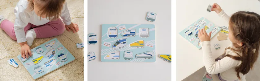 型はめパズルは異なる形状を認識して適切に配置する必要があり、お子さまの空間認識能力や認知能力を向上させます。また、型にはまった瞬間の成功体験がお子さまの達成感や自信に繋がり、問題解決能力の向上も期待することができます。色々な新幹線と一緒にたくさんの成功体験を積みましょう!