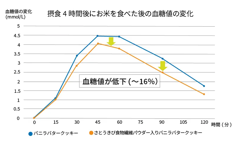 さらに、朝食にそれぞれのクッキーを摂食した4時間後の昼食に白米を摂食した後の2時間の血糖値を測定すると『さとうきび食物繊維パウダー』入りバニラバタークッキーを朝食に摂食した場合に優位に低くなる(~16%)ことが観察されました。