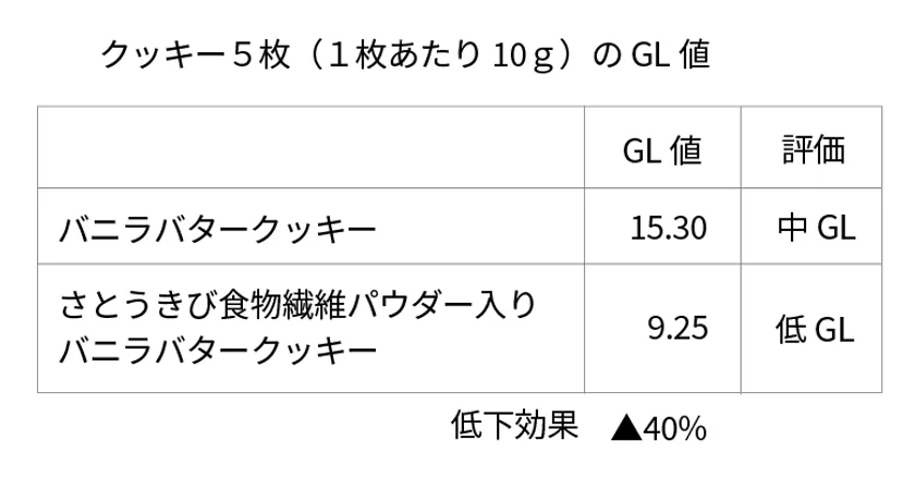 グルコースのGI値を100とすると、『さとうきび食物繊維パウダー』入りバニラバタークッキーはプレーンのバニラバタークッキーと比べGI値が14低下(約30%低下)しました。