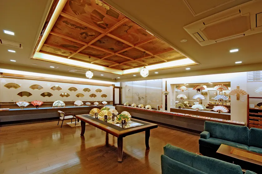 京都の中心部に構える本店は旧店舗の部材を使って随所に古い当時の面影を残しております。2階フロアには明治35年に完成した天井画があり京都画壇48名による扇面画を見上げることが出来ます。