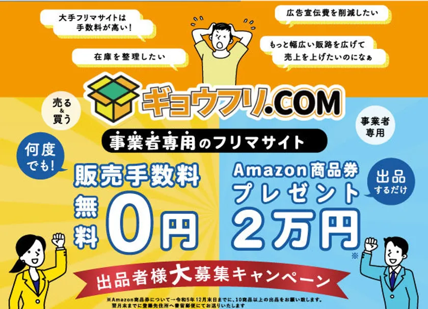 現在、ギョウフリ.COMではサイトのオープンを記念して、期間限定の「出品者様大募集キャンペーン」を開催しています。2023年12月末日までにギョウフリ.COMに10商品以上の商品の出品をされた方を対象に、Amazon商品券2万円分をもれなくプレゼントしております。