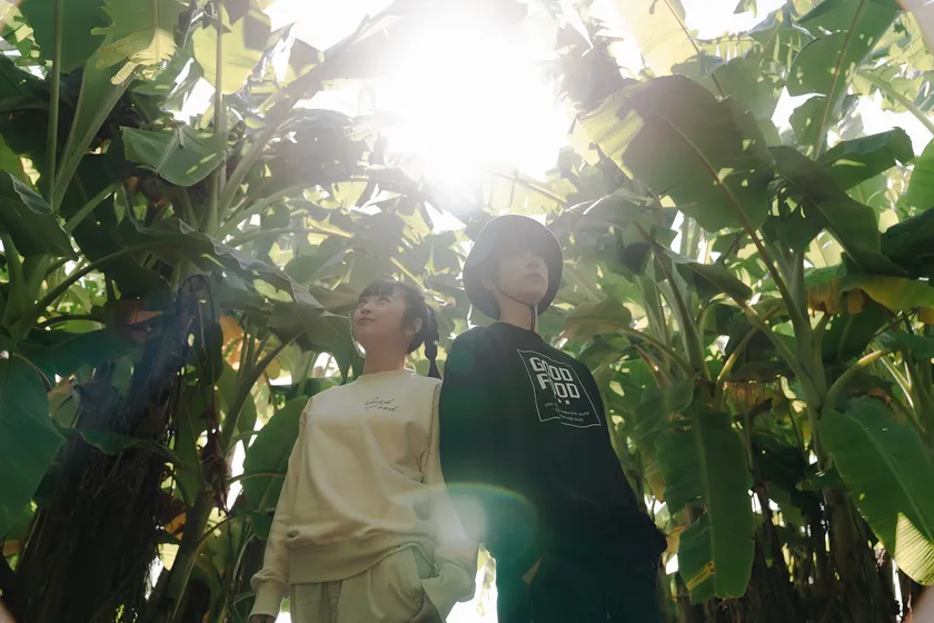 今回、バナナ園で撮影させてもらい、初めてバナナの木を見ましたが、茎はかなり太くて大きく、これを破棄するのは大変なことだと容易に想像できました。そんな茎も、工夫して生まれ変わらせれば私たちに必要な繊維・衣服になる。みんなを笑顔にする、素敵な取り組みです。バナナたちもまさか私と金田さんが着ている服が、自分たちから出来ているとは思っていなかったと思います。優しい着心地にゆったりシルエットでリラックスできて、環境にも人にも優しい、太陽が似合うウェアです。