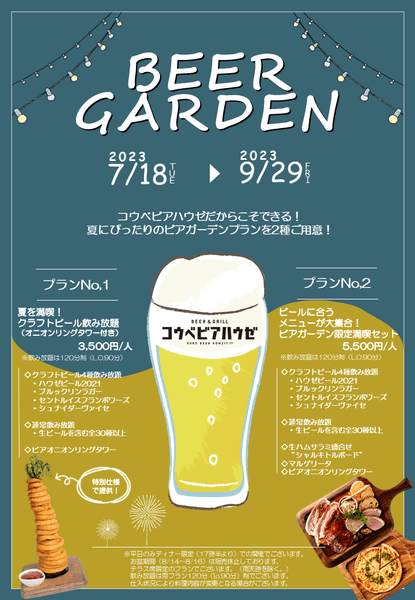 神戸三宮のビアホール「BEER&GRILL コウベビアハウゼ」において、2023年7月18日(火)から9月29日(金)まで、平日夜のテラス席限定で2種類のビアガーデンプランを提供いたします。