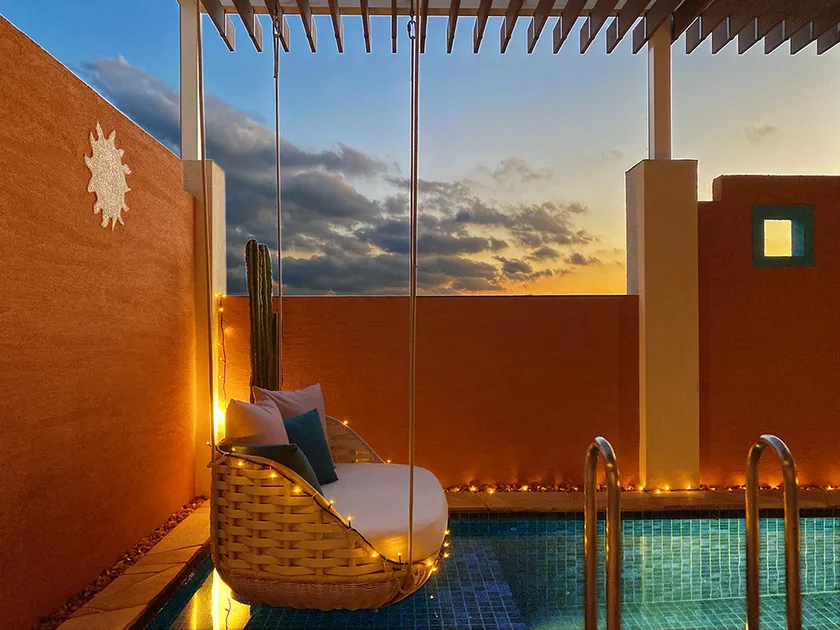 サンタフェの建築様式やライフスタイルをイメージし、素材感のある手作り家具やファブリックで整えました。テラスには冬でも楽しめる温水プライベートプールを備え、水上には心地いいソファのようなブランコが吊り下げられています。ここに座って足をチャプチャプさせながら、少し身体が冷えたら、隣りの温泉露天風呂へ…。心ゆくまで、たっぷり癒やされていただけます。