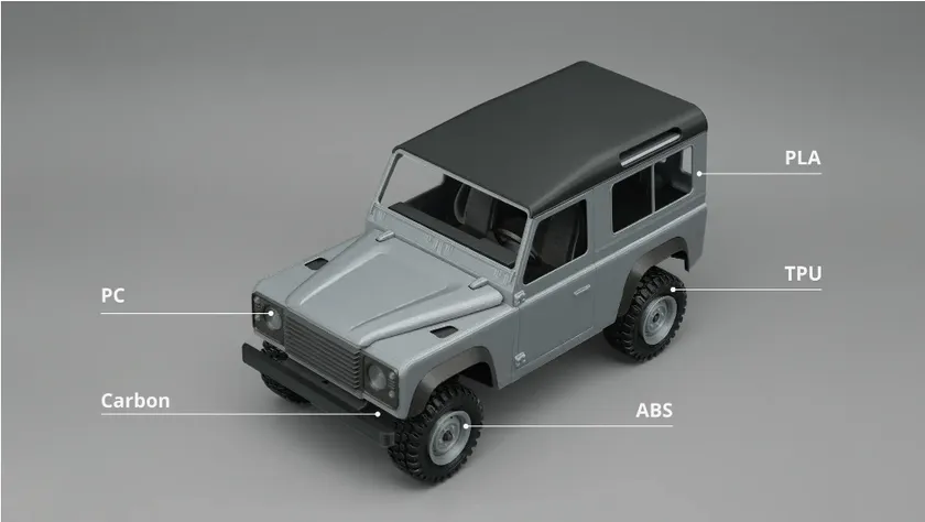 低温で簡単に印刷できるPLAやPETGに加え、量産にも適しているカーボン/ガラスファイバー入りの材料やABSなど幅広く対応可能です。