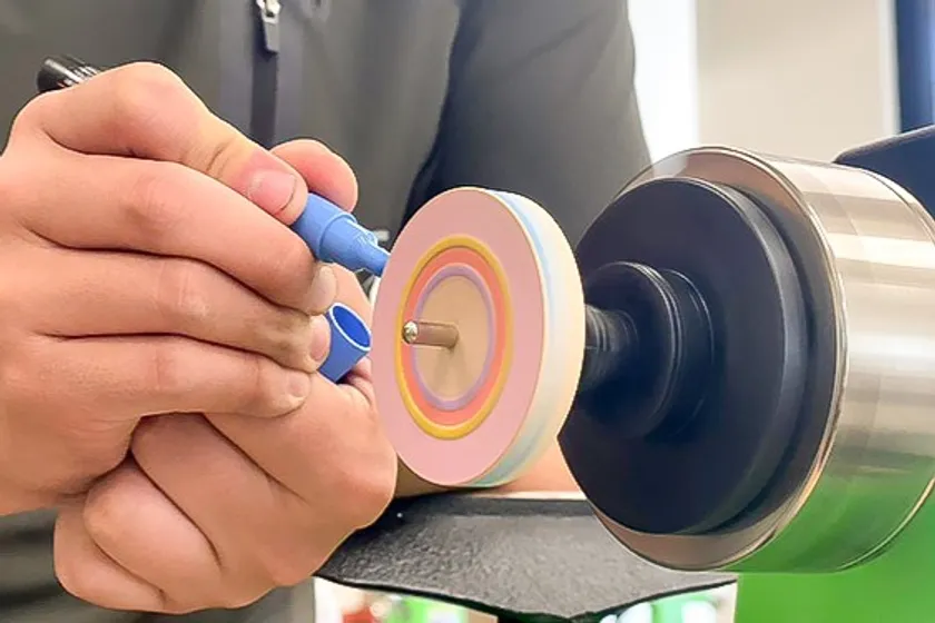 木工旋盤という木材を回転させる機械をつかってコマ絵付け