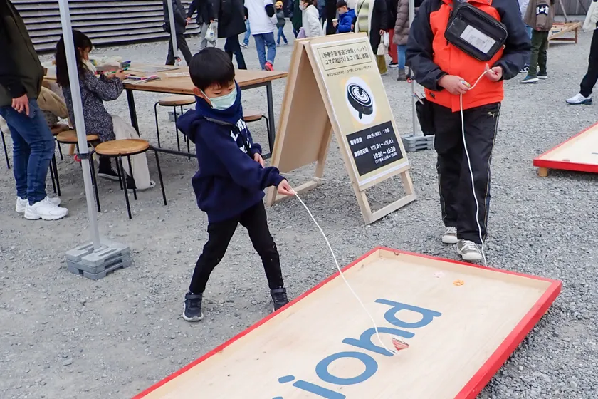 木材を回転させる機械「木工旋盤」にセットしたコマにペンを当てて絵付けができる体験です。絵付け体験後にすぐコマを回して遊ぶことができます。コマ回しは、コマの回る音が悪霊を追い払うと考えられており、縁起の良い昔ながらのお正月遊びです。
