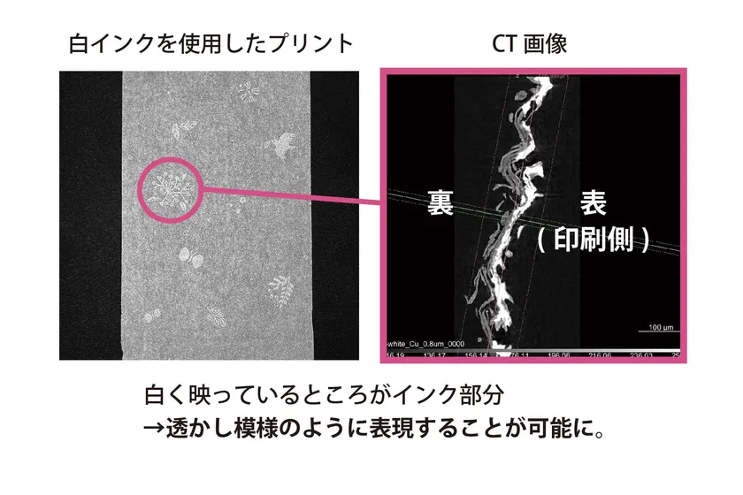透かし模様風なデザインを白い紙に印刷するために、インク内の顔料や粘度を緻密に調整することで実現しました。これにより、従来の有色プリントとは違う、エレガントかつ繊細なデザインを生み出しました。