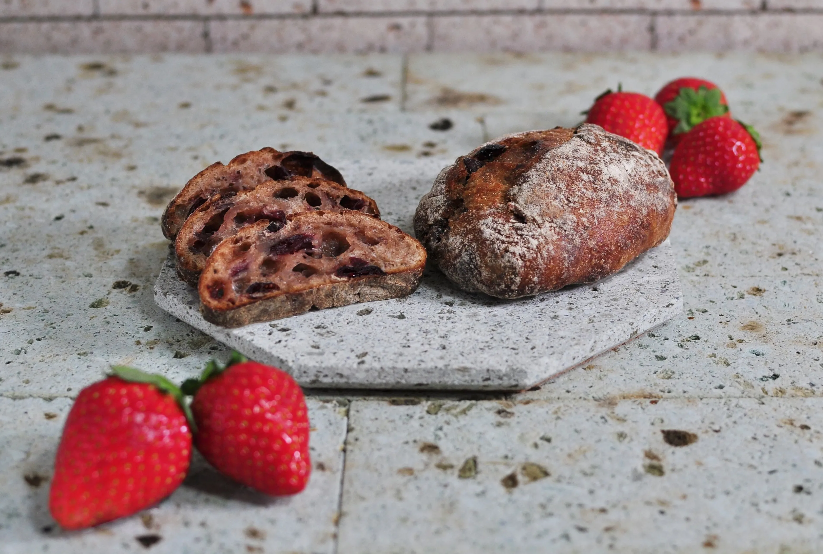 ストロベリー、クランベリー、レモンピール、カシューナッツを栃木県産とちおとめピューレで漬け込み、生地に練りこみました。高加水で口溶けが良く、もっちりとした食感です。