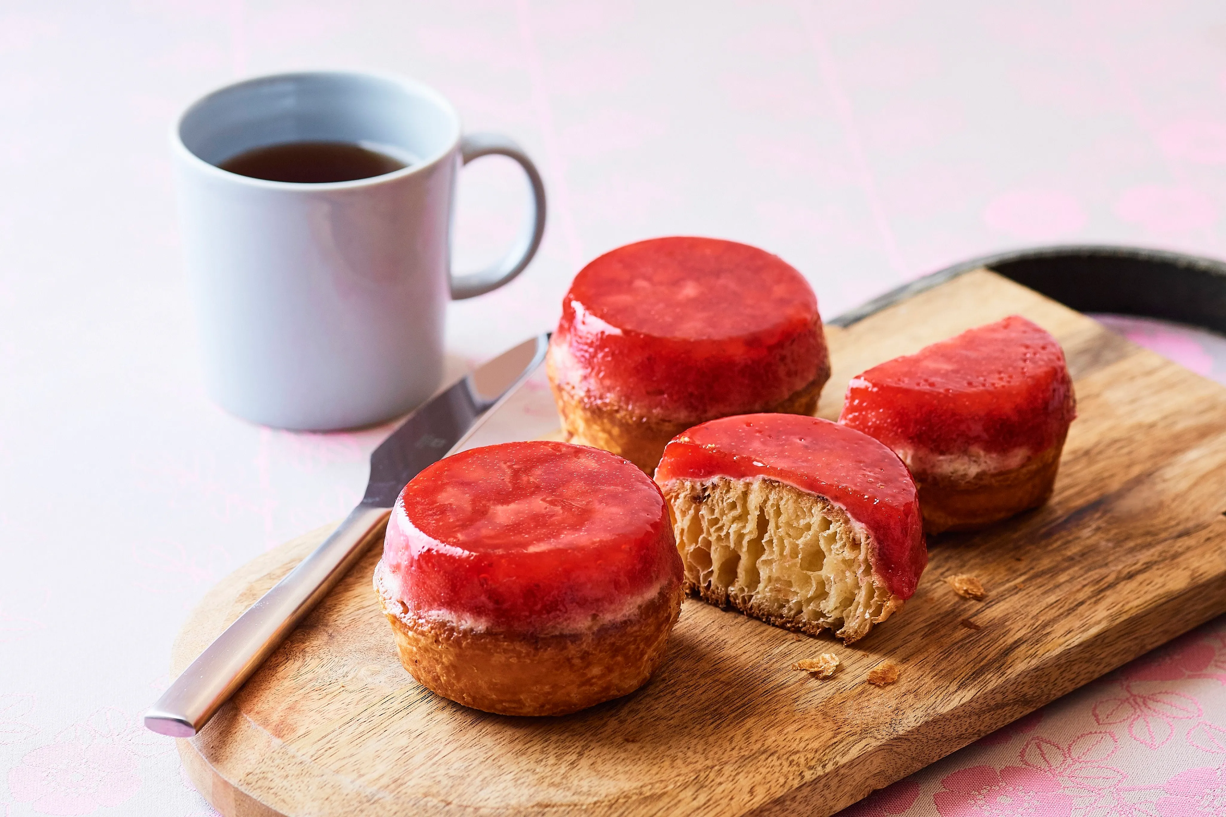 サクサクとした食感のデニッシュ生地に、いちごの果肉入りゼリーとマスカルポーネチーズを組み合わせました。鮮やかないちご色の見た目もかわいい一品です。