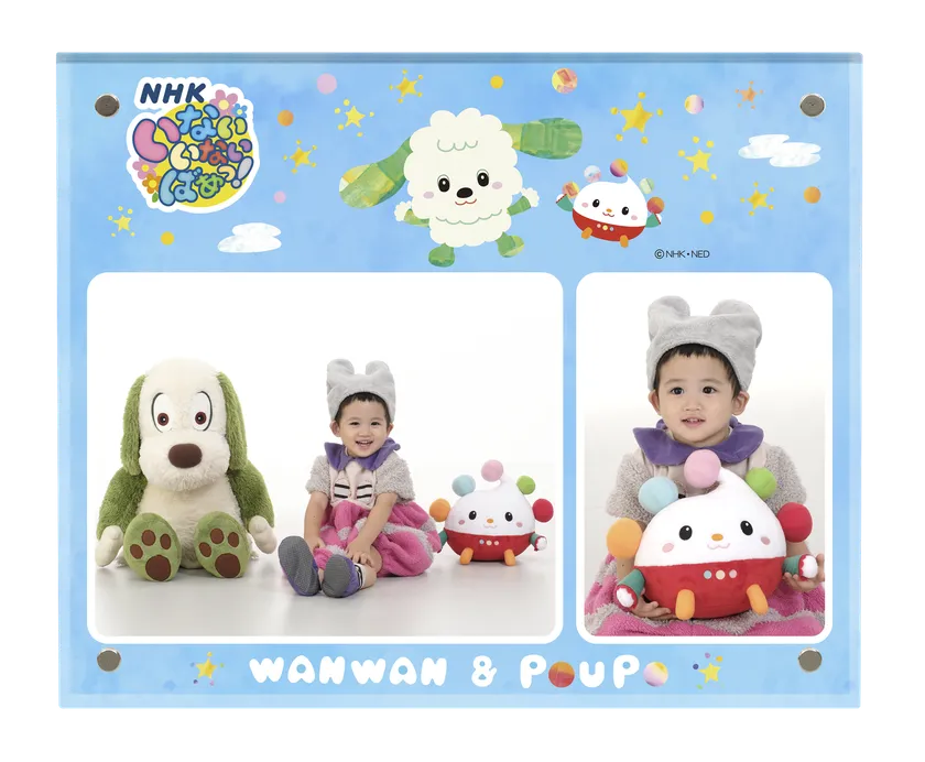 「いないいないばあっ!」なかよしフォトでは、撮影基本料4,400円(税込)で、《おうちゃん》や《ピカピカブ~!》のなりきり衣装を着て《ワンワン》&《ぽぅぽ》のビッグサイズのぬいぐるみと一緒に撮影ができます。《ピカピカブ~!》の衣装は80・90cmで6ヶ月から2歳、《おうちゃん》の衣装は110cmで2歳以上のお子さまにおすすめです。撮影パターンは、お一人、ごきょうだい、ご家族のなかからお好みの1パターンをお選びいただけます。なかよしフォトパックをご購入いただくと限定デザインのクリスタルパネルと撮影証明書がついてきます。