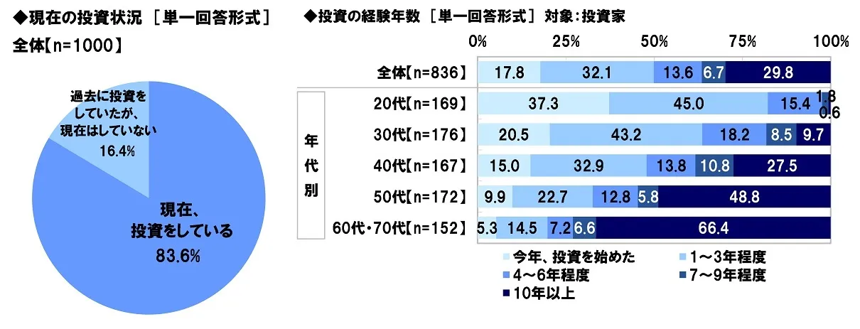 全国の20~79歳の投資経験者1,000名(全回答者)に、現在の投資状況について聞いたところ、“投資家”(「現在、投資をしている」と回答した人)は83.6%、“投資離脱者”(「過去に投資をしていたが、現在はしていない」と回答した人)は16.4%となりました。