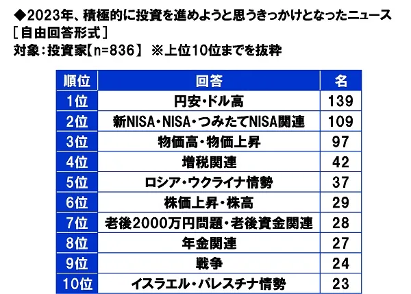 今年、積極的に投資を進めようと思うきっかけとなったニュースを聞いたところ、1位「円安・ドル高」(139名)、2位「新NISA・NISA・つみたてNISA関連」(109名)、3位「物価高・物価上昇」(97名)、4位「増税関連」(42名)、5位「ロシア・ウクライナ情勢」(37名)となりました。円安・ドル高を投資活動の好機と捉えた人が多いのではないでしょうか。また、2024年に制度改正が行われるNISA関連のニュースも上位となりました。