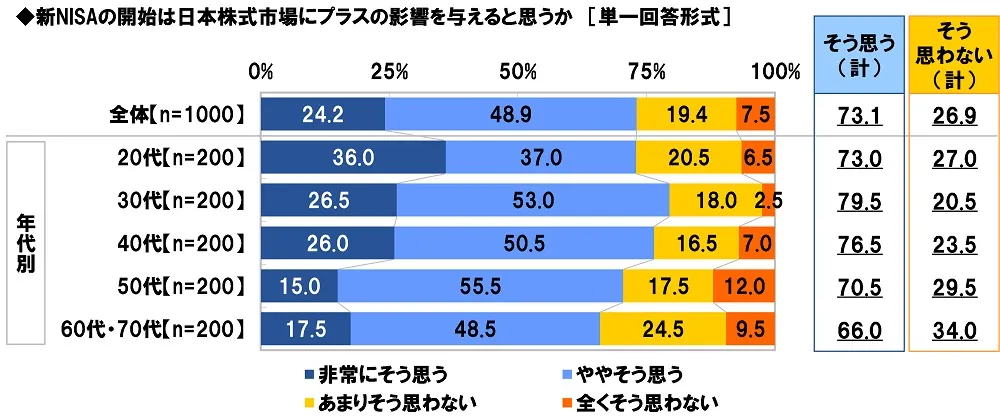 新NISAの開始は日本株式市場にプラスの影響を与えると思うか聞いたところ、「非常にそう思う」は24.2%、「ややそう思う」は48.9%で、合計した『そう思う』は73.1%、「全くそう思わない」は7.5%、「あまりそう思わない」は19.4%で、合計した『そう思わない』は26.9%となりました。NISAの拡充・恒久化は日本株式市場へ好影響を与えるという見通しを持つ人が大半を占めました。