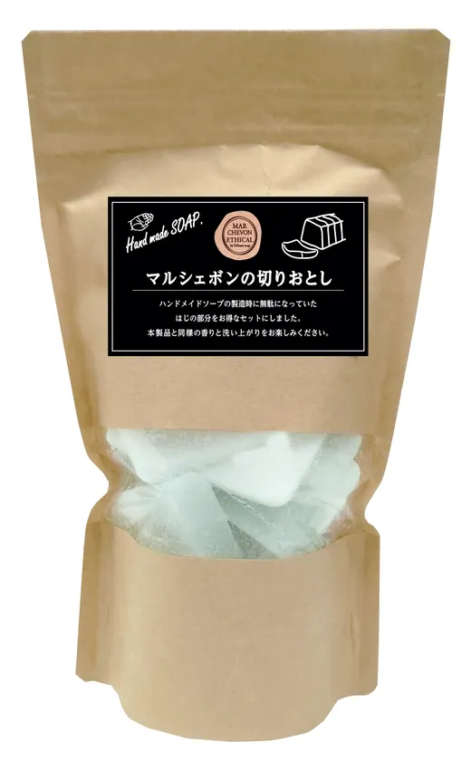 そこで無駄になってしまっていた“はじの部分”を「マルシェボンの切りおとし」として商品化いたしました。資源の無駄を減らすことで環境保護に貢献する、地球想いのやさしい石鹸です。