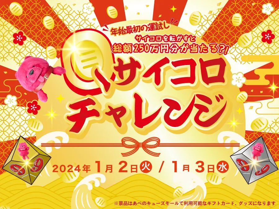内 容:巨大サイコロを転がして、見事「9」の目が出ると、キューズモールギフトカード、「アベーノアベーノ」の目がでるとキューズモールグッズをプレゼントします。当日のあべのキューズモールでのお買い上げレシート額に応じて、金か銀のサイコロに挑戦可能です。※おひとり様1日3回まで