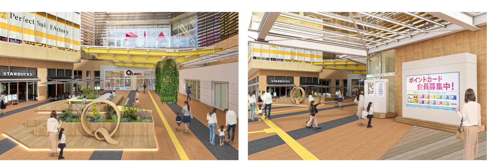 また、大阪3大ターミナルに位置するあべのキューズモールの4階屋外空間に「Q’s garden」をオープンし、エリアにおいて希少なつどい、くつろげる庭が誕生します。あまがさきキューズモールの2階エントランスでは、施設の顔となり、待ち合わせスポットにも最適な「きゅ~ずまえ」が誕生し、よりくつろぎを感じられる心地よい施設へと進化します。