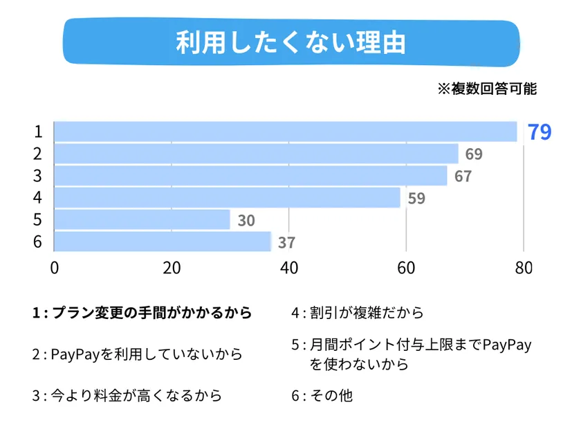 ペイトクを利用したくない理由で一番多かった意見は「プラン変更の手間がかかるから」で79票を集めました。次いで、「PayPayを利用していないから」が69票という結果になっています。
