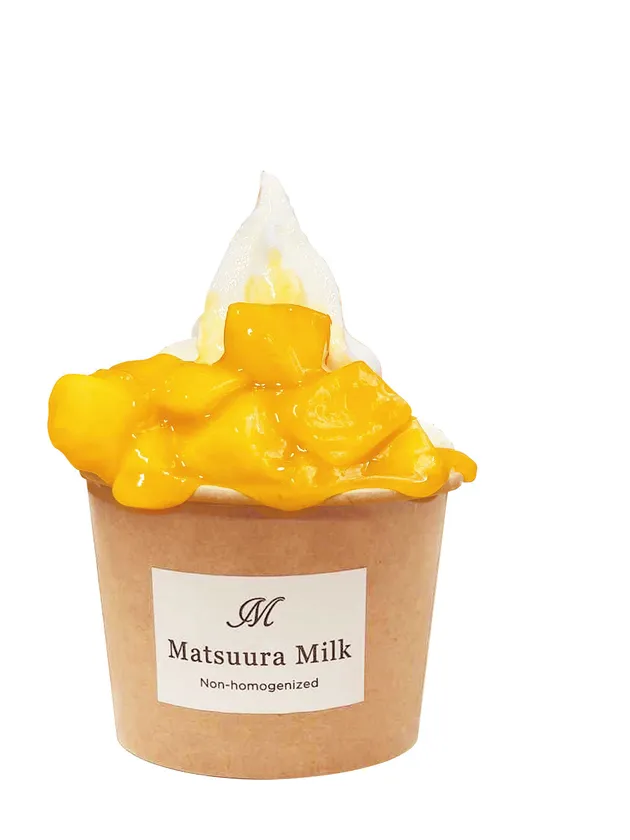 宮崎県産マンゴーをトッピングし、さらにマンゴーの濃厚ソースをかけて仕上げたソフトクリーム。