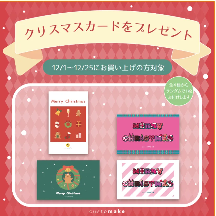 株式会社トーマン・トイズが展開するキャラクターグッズのオーダーメイドサービス「Customake(カスタメイク)」は、2023年12月1日(金)~12月25日(月)までの期間中に公式Webサイトよりご注文いただいたお客様へ「Customakeオリジナルクリスマスカード」をプレゼントする「クリスマスフェア」を開催中です。