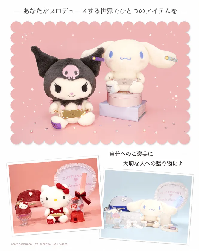 ぬいぐるみ、ポーチ、キーホルダーの中からお気に入りのアイテムをセレクト。キャラクターラインナップは全12種類。ここでしか出会えない、株式会社サンリオのキャラクターたちのオリジナルデザインを見つけましょう。