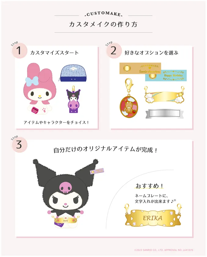 Customake(カスタメイク)は、お気に入りのキャラクターのアイテムをカスタマイズして、世界で一つのオリジナルアイテムを作ることができるキャラクターカスタマイズショップです。お気に入りのキャラクターのぬいぐるみやポーチ、キーホルダーを、あなたの思いのままにカスタマイズできます。方法はとってもカンタンです。まずは、サイトにアクセス!