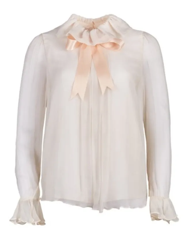 フリルが付いた襟と前部の緩いプリーツが特徴の淡いピンクのクレープブラウスは、後にダイアナ妃のウエディングドレスを手掛けたことで有名な、デザイナーのデイヴィッド・エマニュエルとエリザベス・エマニュエル夫妻によって制作されました。ダイアナ妃は、用意されたさまざまな洋服の中から、このブラウスを見るなり一目ぼれして、誰が作ったのかと尋ね、そこからエマニュエル夫妻に問い合わせが来たそうです。