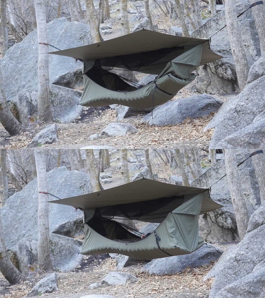 パッケージ内容:蚊帳付きハンモック、レインフライ、エアマット、バンティングバナー、ウェルカムマット、スプレッダーバー、ツリーストラップ、ペグ、ガイロープ、収納ポーチ