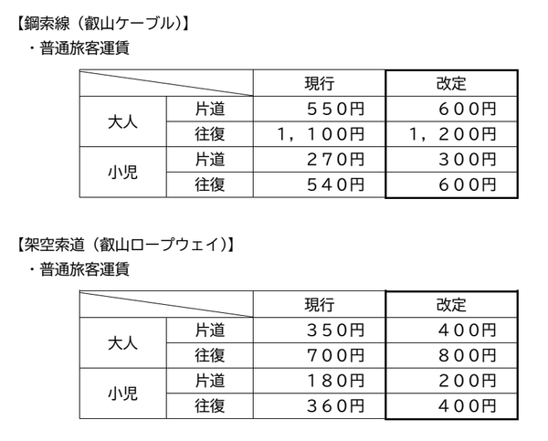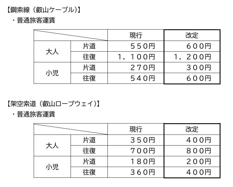 叡山ケーブル・ロープウェイの旅客運賃改定の実施について