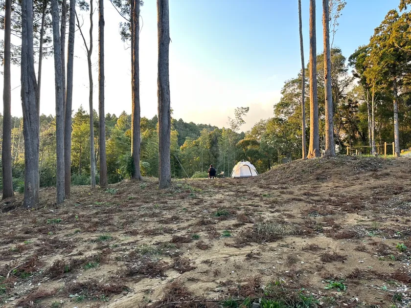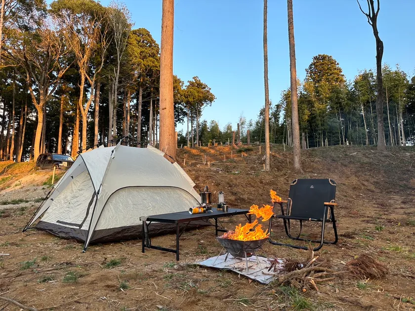 高台にある林間キャンプ場で、30mを越える木々に囲まれ夜は焚き火をしながら満開の星を望む、都会の喧騒から離れ大自然に癒されること請け合いです。