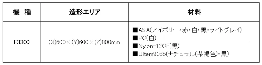 対候性材料の“ASA”、耐久性と形状安定性に優れた“PC(ポリカーボネート)”、ナイロンベースの材料にカーボンの短繊維を複合し曲げ強度に優れた“Nylon 12CF”、そしてFST(火、煙、毒性)の認可を持ち優れた耐熱性および化学耐性に優れた“ULTEM9085”が使用できます。