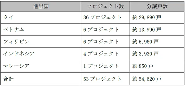なお、本プロジェクトにより、当社のフィリピンにおける住宅分譲事業は6プロジェクト(約5,960戸)、また海外における住宅分譲事業全体では53プロジェクト(約54,620戸)となります。