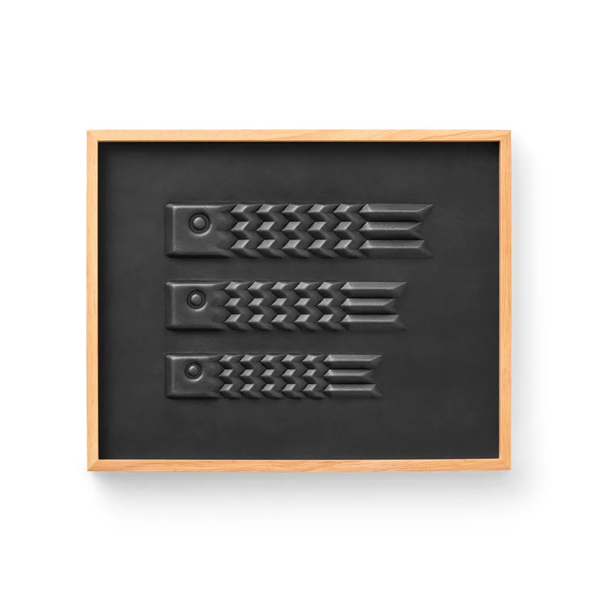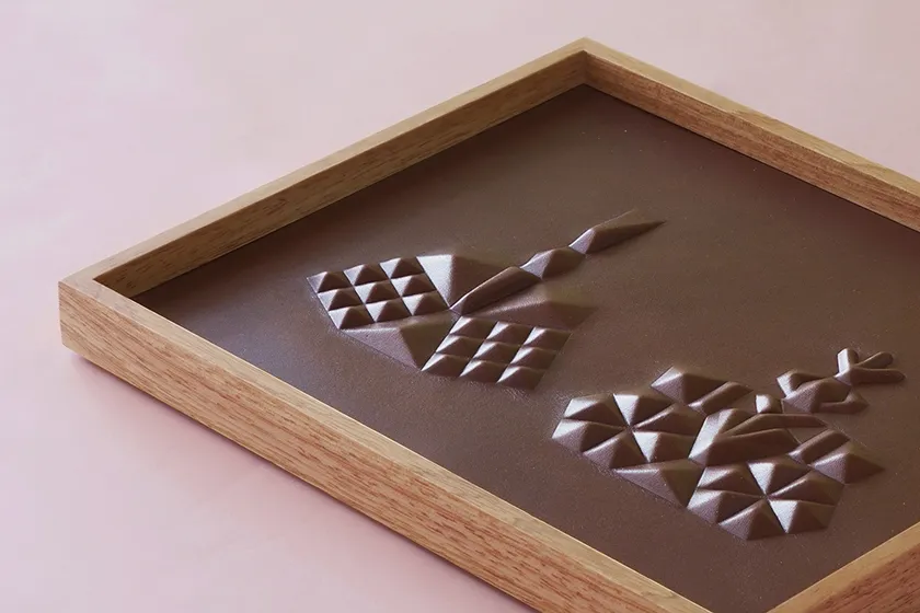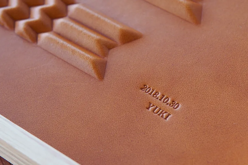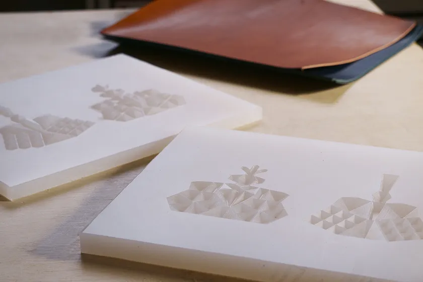 従来の革しぼりは木製の型を使用しているため単純な形状になりますが、3D切削加工した樹脂型で革を上下からはさみ込むことで複雑な凹凸形状を製作可能にしています。その独自技術を生かして新たなプロダクトを開発しました。