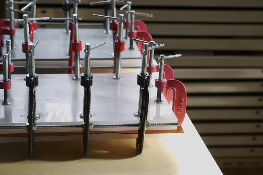 3Dデータを製作→CNC自動フライス盤にて樹脂製の型を切削加工→革を切り出し水で濡らしてから、雄型と雌型で上下から挟み込んでプレス→クランプで固定→乾燥と、非常に手間暇がかかる工程になります。