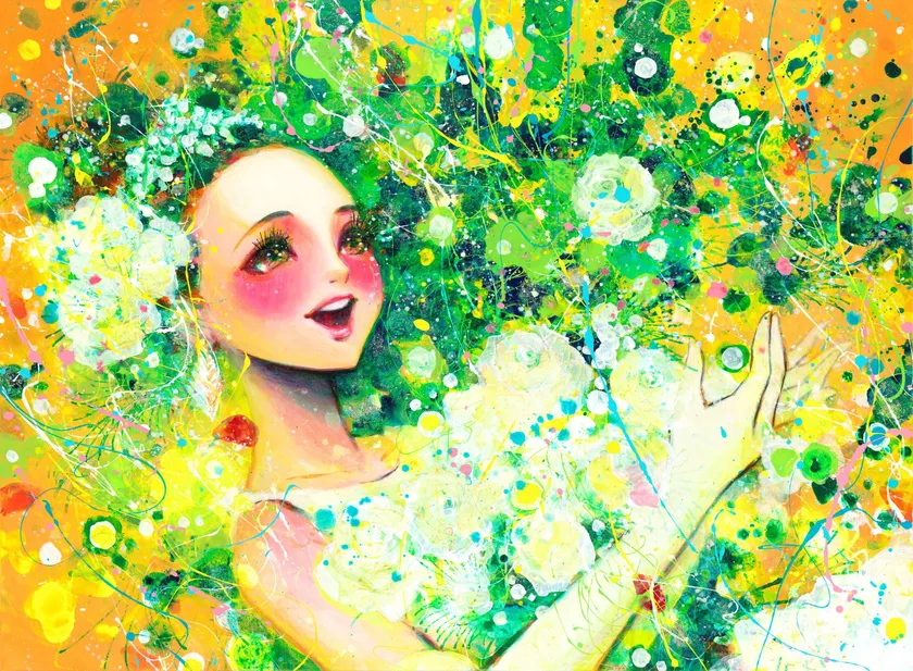 「地球・果実・輝く未来」をテーマに、女性の内面の美しさをアートで表現する画家、未来音羽。アクリル画材で描いた、こころがキラキラする完全なアナログ原画や人気版画など約80点が鑑賞できます。