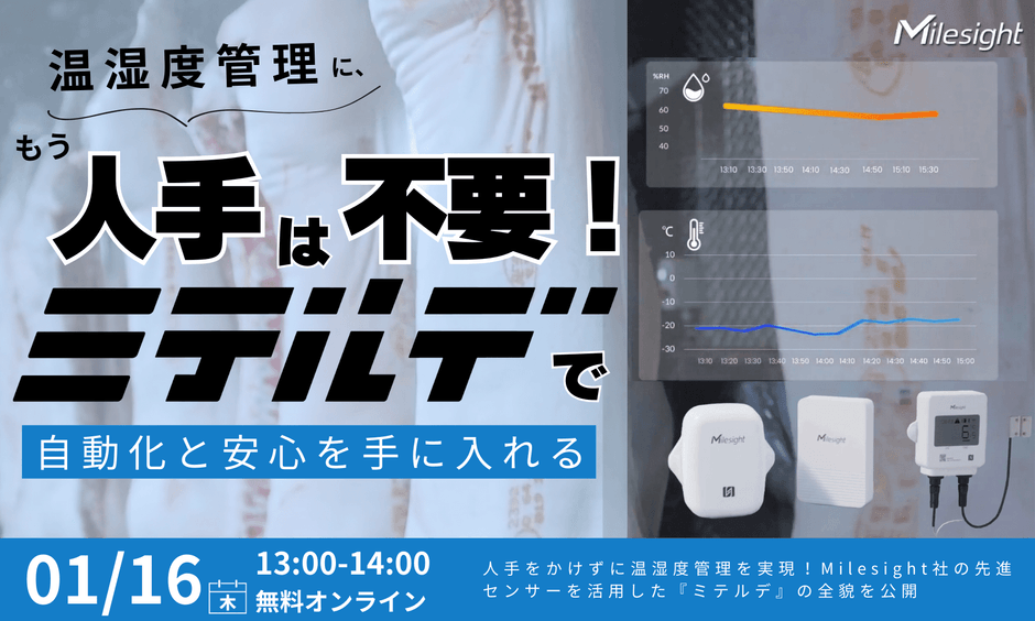 食品製造現場のDX化を支援する株式会社カンブライト(本社:京都府、代表取締役:井上和馬)は、2025年1月16日(木)13:00~14:00、無料オンラインセミナー「温湿度管理に、もう人手は不要!『ミテルデ』で自動化と安心を手に入れる」を開催いたします。本セミナーでは、Milesight社の先進センサー技術を活用した「ミテルデ」による温湿度管理の自動化の仕組みや、その具体的な導入効果を解説します。