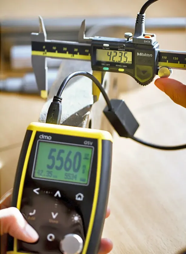 『QSV DLC-M』は、ミツトヨ製のノギスと連携が可能な超音波音速計です。超音波音速測定では、検査箇所の正確な厚さを音速計に入力する必要がありますが、QSV DLC-Mではノギスで計測した厚さの転送が可能で、都度手入力する必要がありません。
