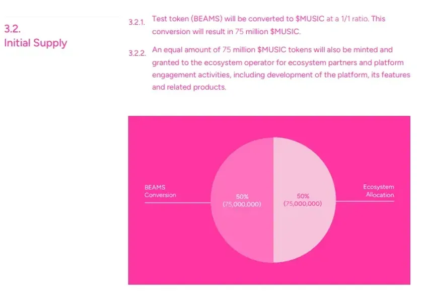これまでテストトークンとしての役割を果たしてきた「BEAMS」は、1:1の比率で「$MUSIC」に交換できます。例えば、「3,000 BEAMS」を所有している場合、「3,000 $MUSIC」に交換できます。これにより、当初予定していた供給量の半分、「75,000,000 $MUSIC」トークンが利用されることになります。