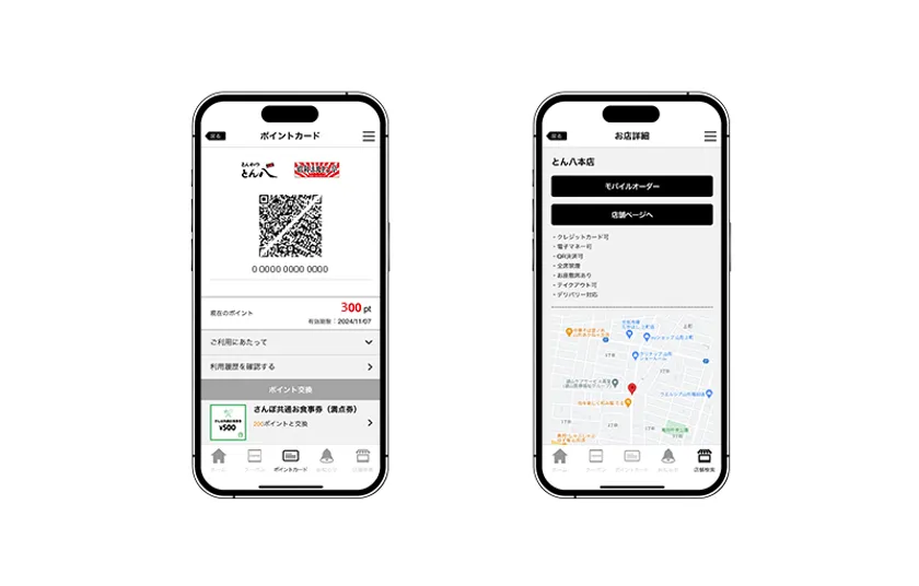 本アプリは、『とんかつとん八』『昭和ホルモン亭』(一部店舗)の会員向けアプリです。会員証機能を搭載し、店舗でのお会計金額に応じてポイントが付与されます。貯まったポイントは、1ポイント=1円として次回以降利用でき、ポイント数に応じてクーポンと交換することも可能です。