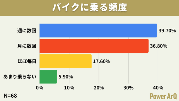 バイクに乗る頻度は「週に数回」39.7%、「月に数回」36.8%、「ほぼ毎日」17.6%となり、約57%が週に数回以上利用しています。
