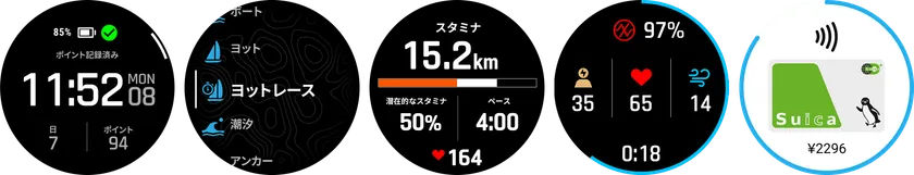 左から、ロングバッテリー、アクティビティメニュー、リアルタイムスタミナ、ヘルスモニタリング機能、Suica