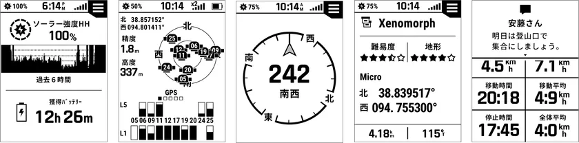 左から、ソーラー充電、GNSSマルチバンド、コンパス、ジオキャッシング、通知機能