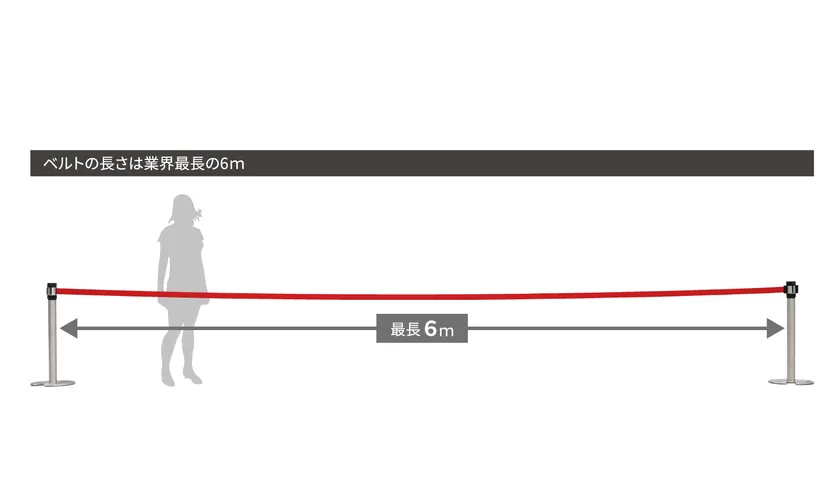 当社のベルトパーテーション「BELPAシリーズ」は、ベルトの長さが業界最長の6mで、一般的な製品の約3倍の長さとなります。