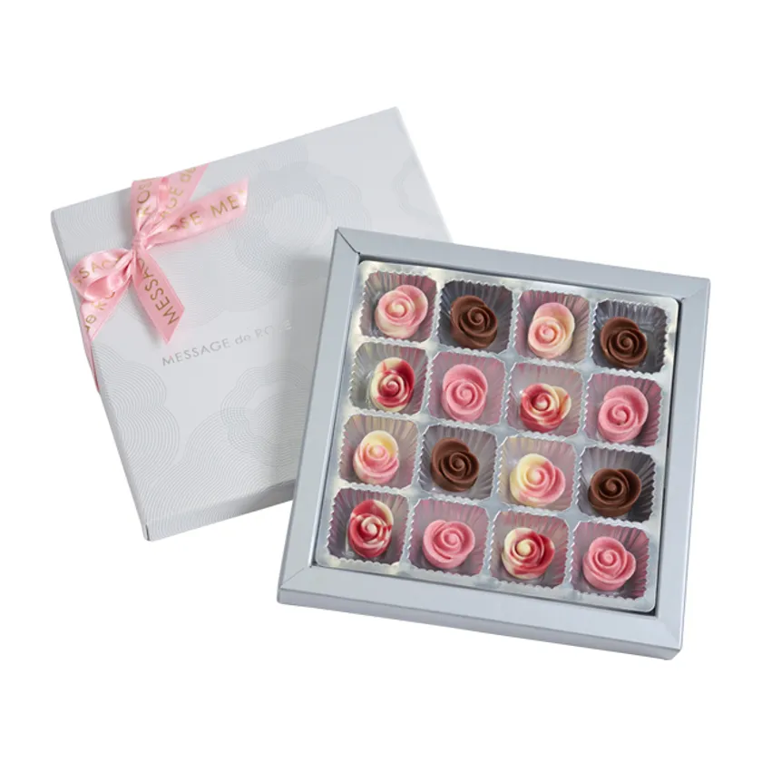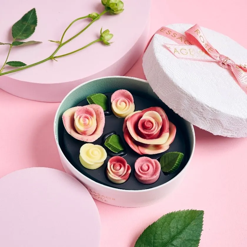 箱詰めされたプリザーブドフラワーのように、彩り豊かな薔薇のつぼみを並べたショコラボックス。イチゴマーブル、ラズベリーマーブル、ラズベリー、ミルクの4つの味が楽しめます。