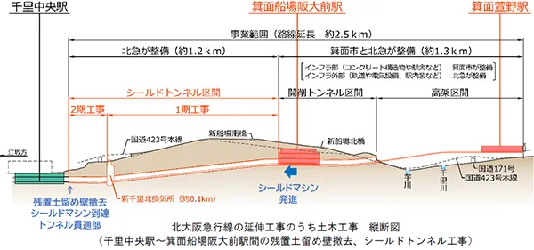 北大阪急行電鉄では、北大阪急行電鉄南北線を千里中央駅から北へ約2.5km延伸し、「箕面船場阪大前駅」と「箕面萱野駅」の2駅を新設する工事を箕面市とともに進めています。