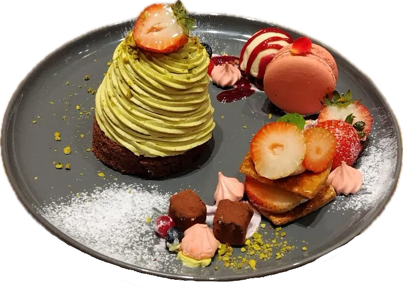 (ピスタチオのモンブラン、マカロン、プチミルフィーユ、バニラアイスなど)