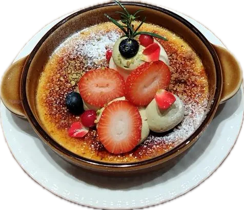 クレームブリュレにピスタチオクリームとバニラアイスをのせました。