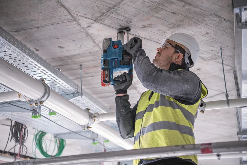 ボッシュ、上向き作業の負担を軽減する小型軽量の プロ用18Vコードレスハンマードリルと吸じんアダプターを発売