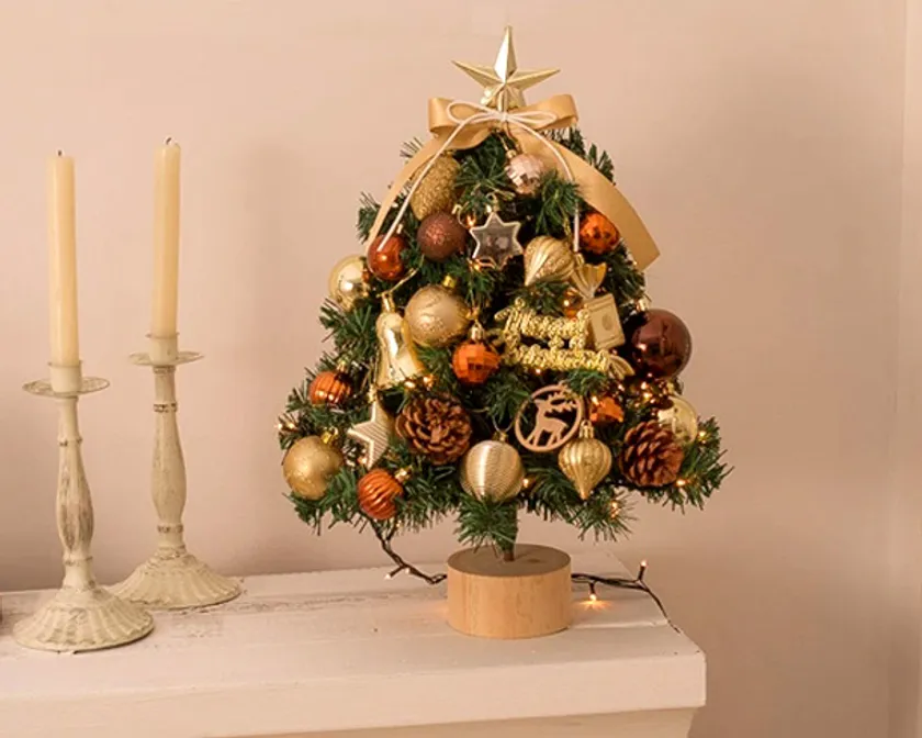 卓上や棚の上、玄関など省スペースにも設置できる45cmの卓上クリスマスツリーは、ゴールド&ブラウン色ベースのお洒落なオーナメント付き。電池タイプのLEDライトで、どこででも安全にイルミネーションが楽しめます。