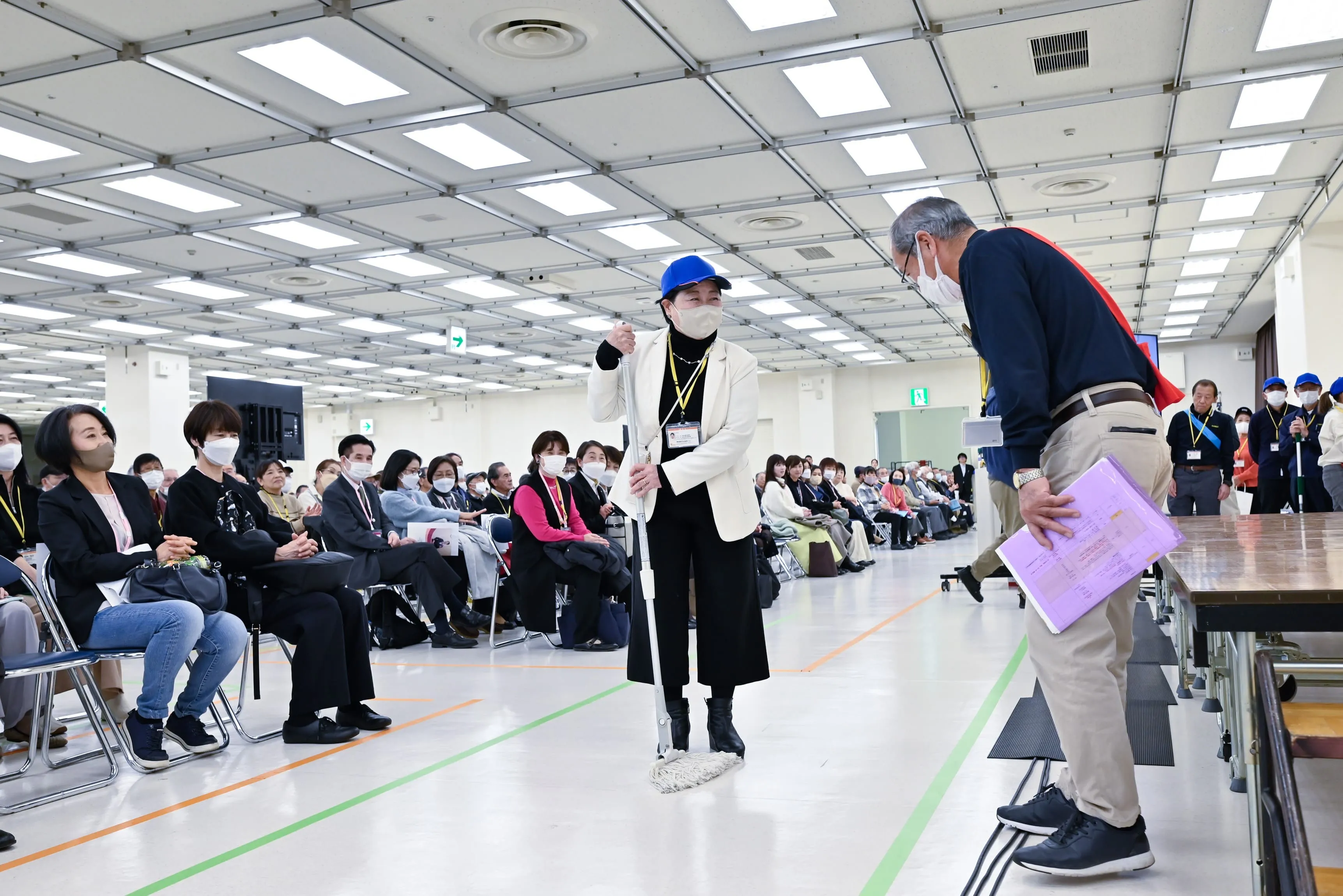 最後に、トーナメント方式で清掃・挨拶の優秀者を競い、選ばれた約1000人中のうち16名が登壇し、デモンストレーションを行いました。
